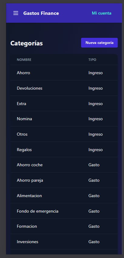Las categorías de ingresos y gastos son totalmente personalizables. Se comparten únicamente entre los usuarios que forman parte de tu grupo, manteniendo la información aislada para quienes no pertenezcan a él.